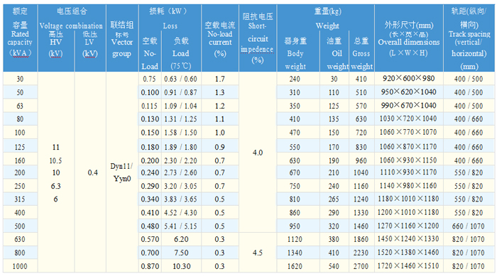 注:高压分接范围:±5%或±2×2.5%;频率:50Hz表中斜线上方的负载损耗值适用于 Dyn11 联结组,斜线下方的负载值适用于 Yyn0 联结组